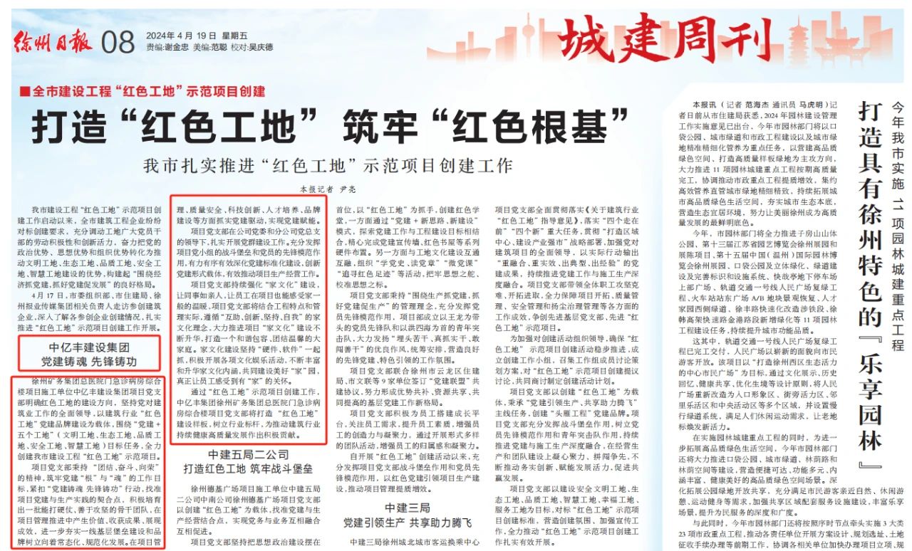 中億豐建設(shè)集團(tuán)項(xiàng)目黨支部通過(guò)“紅色工地”示范項(xiàng)目創(chuàng)建工作,樹立標(biāo)桿,為推動(dòng)建筑行業(yè)高質(zhì)量發(fā)展作出貢獻(xiàn)。